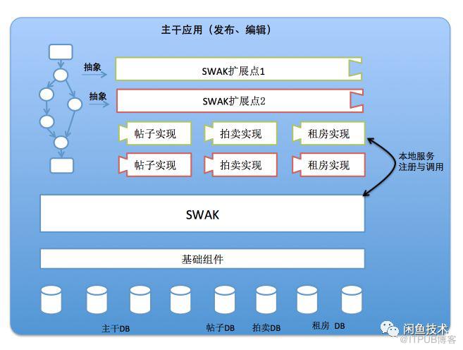 第一轮改造中,闲鱼将原先的商品发布和编辑功能从老应用中抽取到了新应用item。为了实现“平台和业务分离、业务和业务隔离”的源码下载目标,闲鱼自研了一套技术框架SWAK,具体请参考文章《业务代码解构利器--SWAK》,该文介绍了其设计思想和实现原理。接入SWAK框架后,平台逻辑和业务逻辑得到了分离,各个业务(如租房业务、免费送业务)之间的逻辑也不再耦合,而是变成package隔离(当然也是可以做成jar包隔离)。