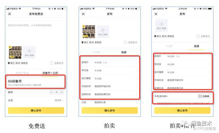 在闲鱼,各种业务所需要存储的东西大同小异,从闲鱼的发布界面上来看就不难发现这一点,都是在基础对象(如标题、描述、图片)之外添加一些业务相关的数据,如拍卖业务中指定拍卖的开拍时间等信息,免费送业务中设置兑换币值,图书业务上设置条形码。即对一本图书进行拍卖当然也是允许的,这就出现了拍卖业务和图书业务叠加起来的复合型业务。